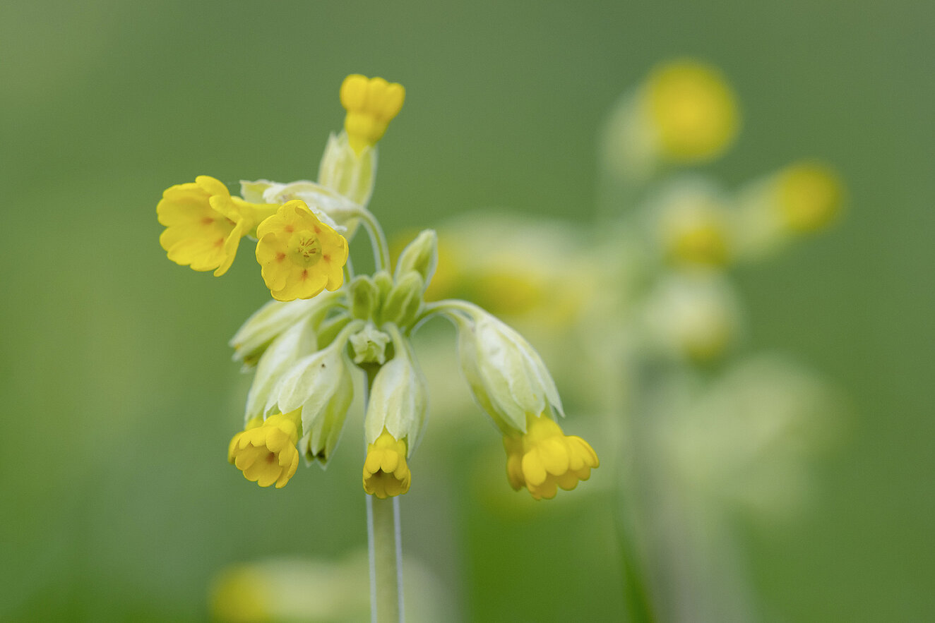 Er ist wie auch die Blätter samtig behaart. An seinem Ende stehen mehrere Blüten, die zu einer nickenden, einseitswendigen Dolde angeordnet sind. Bei den bis zu zwei Zentimeter langen Einzelblüten sind die Kelchblätter zu einer Röhre verwachsen, aus der die Blütenkrone mit fünf Lappen hervorgeht. Während die Blütenkrone von Primula veris L. dottergelb mit fünf orangefarbenen Flecken an ihrem Grund ist, sind die Blüten der Primula elatior L. schwefelgelb – also heller –und tragen keine Flecken in ihrem Schlund. Bemerkenswert ist die Heterostylie der Schlüsselblumen, das heißt das Vorkommen unterschiedlicher Blütentypen innerhalb einer Pflanzenart. So besitzen die Blüten entweder lange oder kurze Griffel mit entgegengesetzt positionierten Staubgefäßen. Prinzipiell kann man beiden Schlüsselblumenarten in nahezu ganz Europa begegnen.