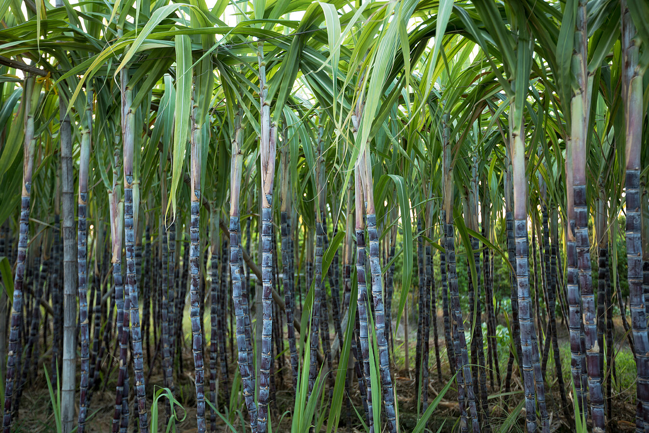Zuckerhaltige Halme Zuckerrohr (Saccharum officinarum) ist eine bis zu sieben Meter hoch wachsende Pflanze aus der Familie der Süßgräser (Poaceae), die schilfartig wächst. Aus weit im Boden verzweigten Wurzelstöcken sprießen hellgrüne bis rotbraune leicht mit Wachs überzogene runde Halme empor. Sie werden bis zu sechs Zentimeter dick und sind in zahlreiche Knoten unterteilt. Die Zwischenstücke (Internodien) enthalten ein weißes, saftiges Mark, in dem Zucker gespeichert ist. Der Zuckeranteil kann bis zu 16 Prozent betragen. Die Blätter sind linealisch, spitz und ganzrandig und durch Kieselsäureeinlagerungen raukantig. Sie können bis zu zwei Meter lang und fünf Zentimeter breit werden. Auffällig ist die dicke Mittelrippe der Blattspreite.