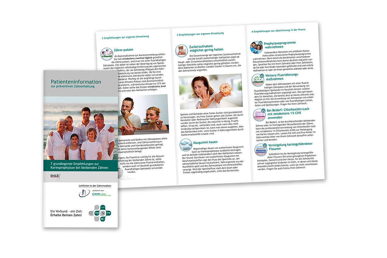 Patientenleitlinie: kostenlos bestellen, auslegen, erklären, verteilen Apotheken können die „Patienteninformation zur präventiven Zahnerhaltung: 7 grundlegende Empfehlungen zur Kariesprophylaxe bei bleibenden Zähnen“ der Deutschen Gesellschaft für Zahnerhaltung (DGZ) kostenlos per E-Mail an info@kommed-bethcke.de bestellen. Sie ist ideal, um sie Kundinnen und Kunden mit nach Hause zu geben – für gesunde Zähne ein Leben lang.
