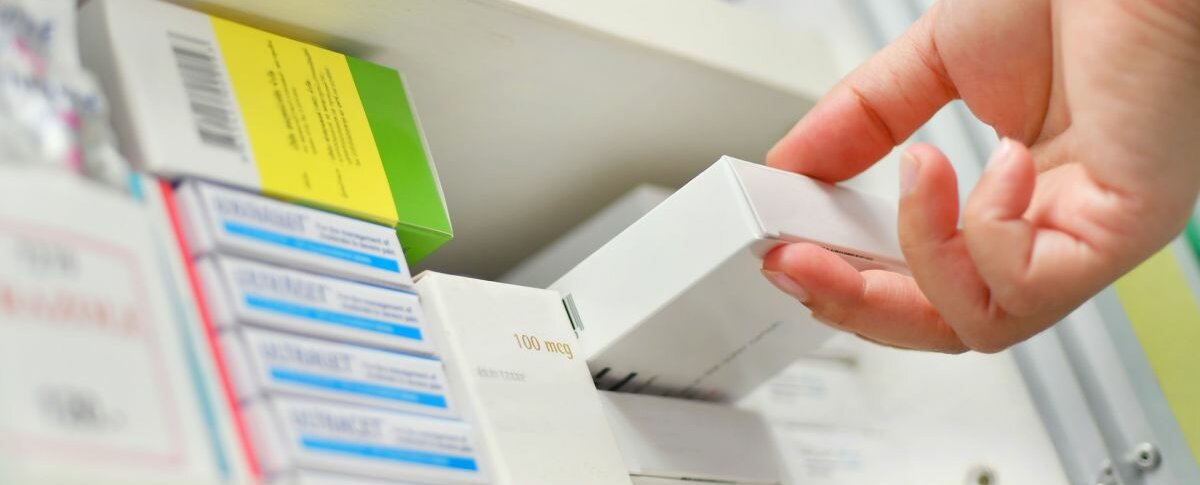 Eine Hand holt ein Medikament aus dem Apothekenschrank.