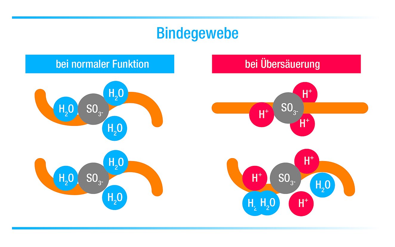 So sind sie zunächst gebunden und belasten das Säure-Basen-Gleichgewicht nicht mehr. Allerdings verliert das Bindegewebe dadurch seine Ladungen und somit auch seine Wasserbindekapazität. Die Folge ist ein Elastizitätsverlust, der die Funktion von Sehnen, Bändern und Knorpel beeinträchtigt. Mechanische Belastungen können schlechter abgefangen werden. Auch die Nährstoffversorgung der Bindegewebszellen ist vermindert. Es kommt leichter zu entzündlichen Prozessen. Die Folge können Rücken-, Gelenkund Muskelschmerzen sein. Naturheilkundler sprechen von „Säurestarre“. Auch die Haut enthält bindegewebige Strukturen, die bei einer Übersäuerung ihr Wasserbindevermögen verlieren. Der Verlust an Elastizität kann sich bei Frauen zum Beispiel als Cellulite äußern.