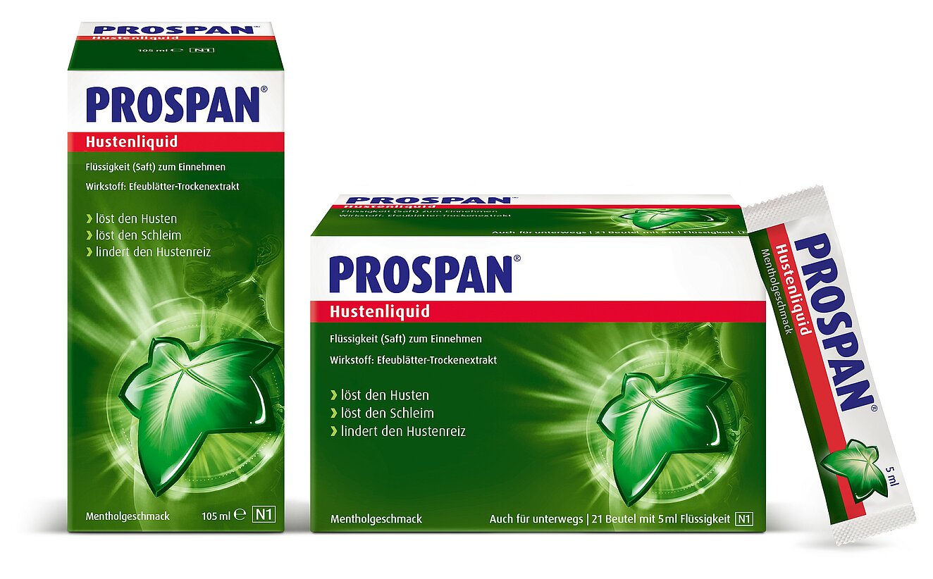 Prospan® Hustensaft, Flüssigkeit zum Einnehmen; Wirkstoff: Efeublätter-Trockenextrakt; Zusammensetzung: 5 ml Flüssigkeit enthalten 35 mg Trockenextrakt aus Efeublättern (5 – 7,5 : 1). Auszugsmittel: Ethanol 30 % (m/m). Sonstige Bestandteile: Kaliumsorbat (Ph.Eur.) (Konservierungsmittel), wässrige Citronensäure (Ph.Eur.), Xanthan-Gummi, Sorbitol-Lösung 70 % (kristallisiert) (Ph.Eur.), Aromastoffe, Levomenthol, gereinigtes Wasser. 5 ml enthalten 1926 g Sorbitol (Ph.Eur.) (Zuckeraustauschstoff) = 0,18 BE. Anwendungsgebiete: Zur Besserung der Beschwerden bei chronisch-entzündlichen Bronchialerkrankungen; akute Entzündungen der Atemwege mit der Begleiterscheinung Husten. Hinweis: Bei länger anhaltenden Beschwerden oder bei Auftreten von Atemnot, Fieber wie auch bei eitrigem oder blutigem Auswurf, sollte unbedingt der Arzt aufgesucht werden. Gegenanzeigen: Überempfindlichkeit gegen wirksamen Bestandteil oder einen der sonstigen Bestandteile. Nebenwirkungen: Allergische Reaktionen (Atemnot, Schwellungen, Hautrötungen, Juckreiz). Häufigkeit nicht bekannt. Bei empfindlichen Personen Magen-Darm-Beschwerden (Übelkeit, Erbrechen, Durchfall). Häufigkeit nicht bekannt. Prospan® Hustentropfen, Flüssigkeit zum Einnehmen; Wirkstoff: Efeublätter Trockenextrakt;Zusammensetzung: 100 ml Flüssigkeit enthalten 2 g Trockenextrakt aus Efeublättern (5 – 7,5 : 1). Auszugsmittel: Ethanol 30 % (m/m). Sonstige Bestandteile: Saccharin-Natrium, Anisöl, Ethanol 96 % (m/m), gereinigtes Wasser. Anwendungsgebiete: Zur Besserung der Beschwerden bei chronisch-entzündlichen Bronchialerkrankungen; akute Entzündungen der Atemwege mit der Begleiterscheinung Husten. Hinweis: Bei länger anhaltenden Beschwerden oder bei Auftreten von Atemnot, Fieber wie auch bei eitrigem oder blutigem Auswurf, sollte unbedingt der Arzt aufgesucht werden. Gegenanzeigen: Überempfindlichkeit gegen wirksamen Bestandteil oder einen der sonstigen Bestandteile. Kinder < 1 Jahr. Nicht für Personen, deren eine Einnahme auch minimaler Alkoholmengen vom Arzt untersagt wurde. Nebenwirkungen:Sehr selten allergische Reaktionen (Atemnot, Schwellungen, Hautrötungen, Juckreiz). Sehr selten selten bei empfindlichen Personen Magen-Darm-Beschwerden (Übelkeit, Erbrechen, Durchfall). Warnhinweise: Prospan® Hustentropfen enthalten 47 Vol.-% Alkohol!