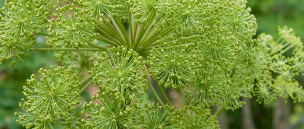 Während die Grundblätter auf langen röhrigen Stängeln sitzen, wachsen die oberen Blätter aus großen bauchigen Blattscheiden heraus. Die großen ballförmigen, grünen Doldenblüten, die aus zahlreichen Einzelblüten zusammengesetzt sind, stehen auf bis zu 15 Zentimeter langen Stielen und blühen von Juli bis August des zweiten Vegetationsjahres. Danach stirbt die Engelwurz in der Regel ab.
