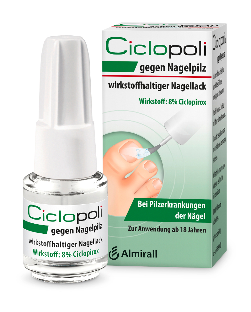 Tausendsassa Ciclopoli® ist ein medizinischer Nagellack mit dem Wirkstoff Ciclopirox, einem Breitbandantimykotikum, das nachhaltig gegen alle gängigen Pilzerreger wirkt. Der multiple Mechanismus wirkt nicht nur auf die lebenden Pilzzellen, sondern auch auf ihre Sporen – und das wirkt sogar bei Faden- und Hefepilzen. Ciclopoli besitzt eine einzigartige Lacktechnologie mit Hydroxypropylchitosan (HPCH), einer Substanz, die aus dem Naturstoff Chitin hergestellt wird.