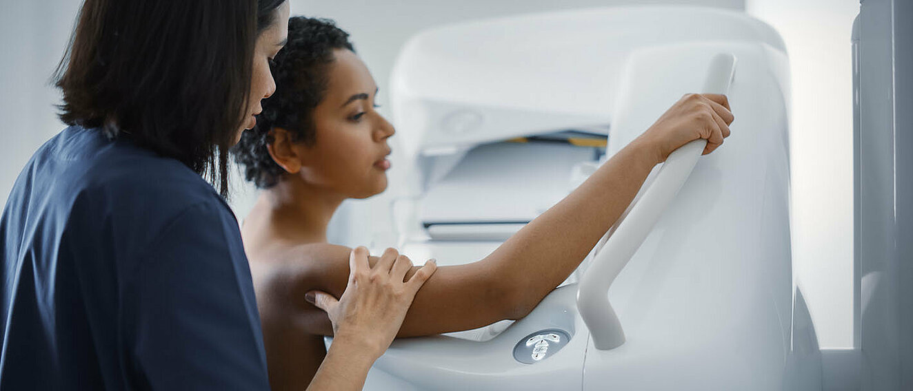 Frau sitzt vor einem Mammographie Gerät. Die Ärztin steht neben ihr und unterstützt sie© gorodenkoff / iStock / Getty Images Plus