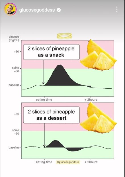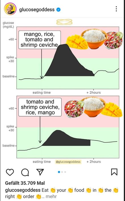 - Zur Essensreihenfolge findet Carmen Klammer ein klares Statement: „Es macht ernährungsphysiologisch keinen Sinn, bestimmte Lebensmittel nacheinander zu essen. Der Magen verdaut nicht nach dieser Reihenfolge.“ Wichtig sei die Gesamtzusammensetzung einer Mahlzeit. Enthält sie Ballaststoffe, Proteine und Fette in Kombination mit Kohlenhydraten, fallen die Blutzuckerwerte stabiler aus. Ein Apfel als Nachtisch oder in Kombination mit Nüssen als Snack führt also zu geringeren Peaks als alleine verzehrt – das ist aber schon lange Inhalt ernährungstherapeutischer Schulungen.
