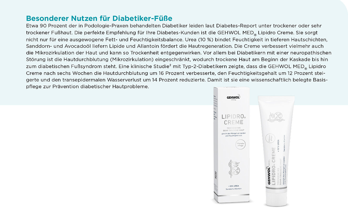 Besonders interessant für Sie als PTA ist die Aussage der Befragten, dass der Impuls zur Durchführung von Vorsorgemaßnahmen überwiegend von Fachkreisen ausgeht. Neben den Ärzten nannten hier 27 Prozent weitere Fachkreise, wie das Apothekenfachpersonal, Fachkräfte für Fußgesundheit und Diabetesberater. Wenn man bedenkt, dass nur etwa ein Drittel der Betroffenen zum Podologen geht und etwa gleich viele an einer Schulung bei einem Diabetesberater teilnehmen, wird die wichtige Rolle der Apotheken deutlich. Vor allem diejenigen Patienten, die noch keine Risikopatienten sind und/oder keinen Versorgungsanspruch für podologische Leistungen haben, können Sie in der Apotheke aktiv beraten und an die Prävention heranführen, denn sie vertrauen Ihrem Rat. Die Studie zeigt auch, dass Diabetes-Patienten auf hohe Qualitätsstandards bei einem Fußpflegeprodukt setzen. 72 Prozent nannten dies als wichtiges Kriterium, 73 Prozent vertrauen dabei ebenfalls der Empfehlung durch Fachkreise. 67 Prozent erachten es zudem als wichtig, dass die Marke auf Fußgesundheit spezialisiert ist und 61 Prozent, dass das Fußprodukt Teil eines Gesamt-Pflegekonzeptes (z.B. GEHWOL MED® aus der Apotheke) ist.