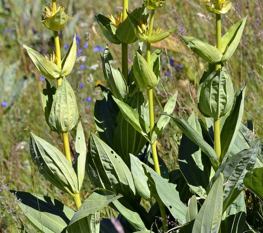 Stattliche Pflanze Der Gelbe Enzian wächst bevorzugt auf steinigen Gebirgsböden, Schutthalden und ungedüngten Weiden. Er ist mit einer wenig verzweigten, armdicken Wurzel im Boden verankert, die bis zu einen Meter lang und bis zu sieben Kilogramm schwer werden kann. Im Frühjahr treibt aus einer grundständigen Blattrosette ein fast anderthalb Meter hoher, fingerdicker hohler Stängel aus. Dieser trägt im unteren Bereich große elliptische, gegenständig angeordnete blaugrüne Blätter, die mit starken Bogennerven durchzogen sind. Nach oben hin bilden sie schalenförmige Tragblätter, in denen drei- bis zehn-gelbblütige Trugdolden bildende Blüten sitzen, die in Scheinquirlen angeordnet sind.