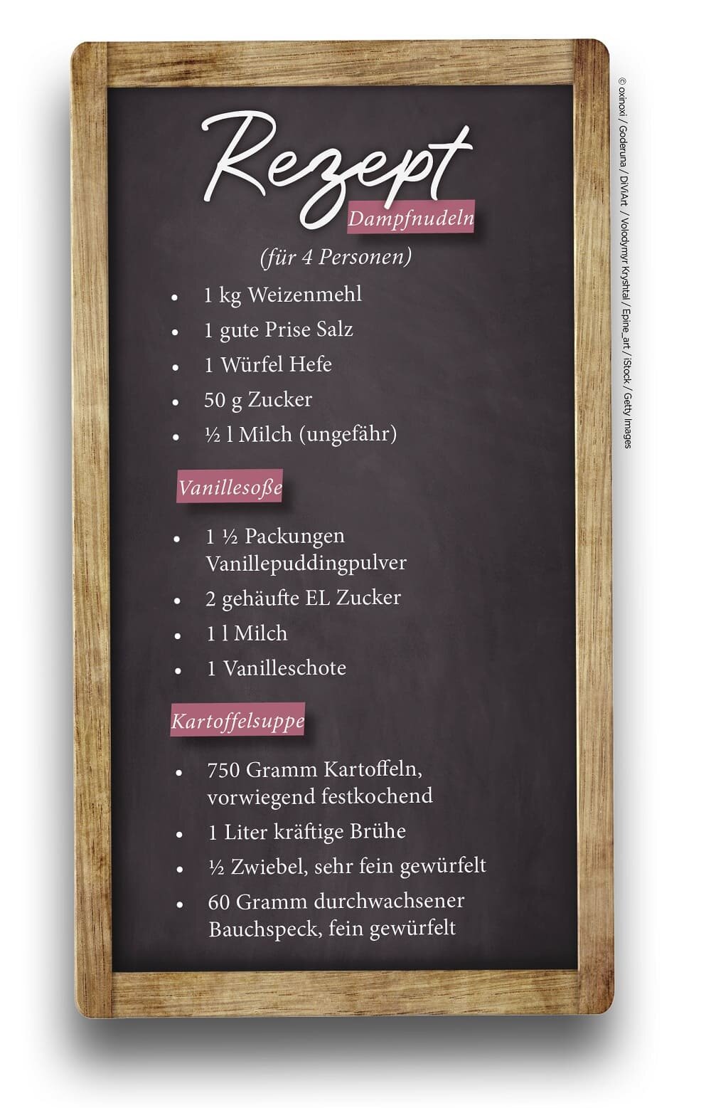 Ähnliches hatte ich schon von meinem Odenwälder Gatten gehört: Die Dampfnudel hat einen göttergleichen Status unter den Traditionsgerichten südlich des Mains. Hausrezepte werden bis aufs Blut verteidigt, und verschiedene Zubereitungsarten stehen jenseits aller Diskussionen, sie sind sozusagen in Stein gemeißelt. Albrecht König, der bei uns im Verlag nur Albi genannt wird und der für alle Fragen rund um den Vertrieb und um Abonnements zuständig ist und ohne den nichts läuft! –, der hatte uns in einer langen Mail von den Gerichten seiner Kindheit berichtet: „Als Kind fand ich es toll, wenn meine Mutter Dampfnudeln gemacht hat. Mit Vanillesoße natürlich, ohne Fertigpulver!“ Ganz wichtig anscheinend: „Man durfte NICHT in den Topf schauen!“ Ich als Nordlicht stand dem ratlos gegenüber. Nicht in den Topf schauen?