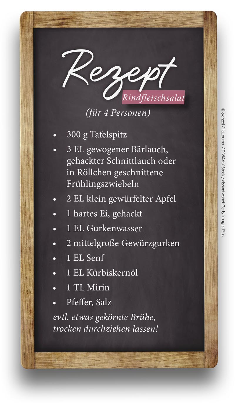 Wir haben dann Bratkartoffeln dazu gegessen, das passte ganz wunderbar. Wem das zu mächtig ist, der kann auf Baguette ausweichen. Und apropos Bratkartoffeln: Ich kann mir auch gut vorstellen, dass der Rindfleischsalat mit den Resten vom Sonntagsbraten gelingt. Probieren Sie es einfach aus!
