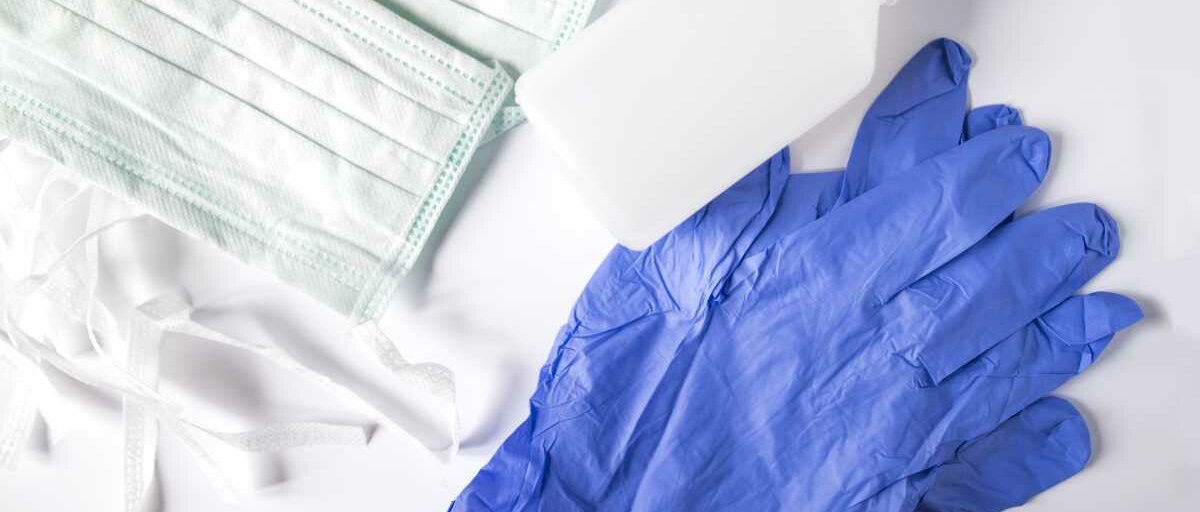 Einmal-Mundschutz, eine Flasche Desinfektionsmittel und Einmalhandschuhe liegen auf einem Tisch.