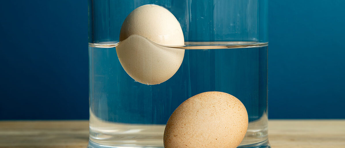 Ein beliebter Eier Frischetest ist der Wassertest. Legen Sie das Ei in eine Schüssel mit Wasser. „Je höher es im Wasser schwimmt, desto größer ist die Luftkammer im Ei“, erklärt Goldnick. Und je größer die Luftkammer ist, desto älter ist das Ei. Schwimmt das Ei an der Oberfläche, sollten Sie es besser nicht mehr essen. „Ich würde es zumindest nicht mehr zum Beispiel als gekochtes Ei essen“, so der Experte. „Man kann es höchstens noch für einen Teig verwenden.“ So lässt sich ein schlechtes Ei erkennen.