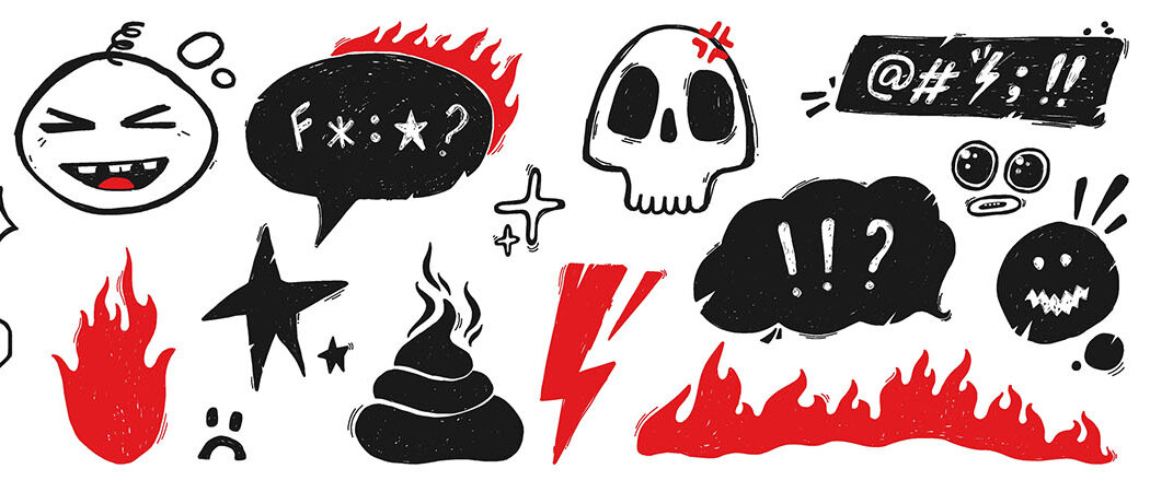 Mehrere schwarze und rote Icons auf weißem Grund, zum Beispiel ein Totenkopf, Ausrufezeichen und Fragezeichen, Flammen, ein Kasten voller Sonderzeichen oder ein Kothaufen.© Kseniia Gorozhina / iStock / Getty Images Plus