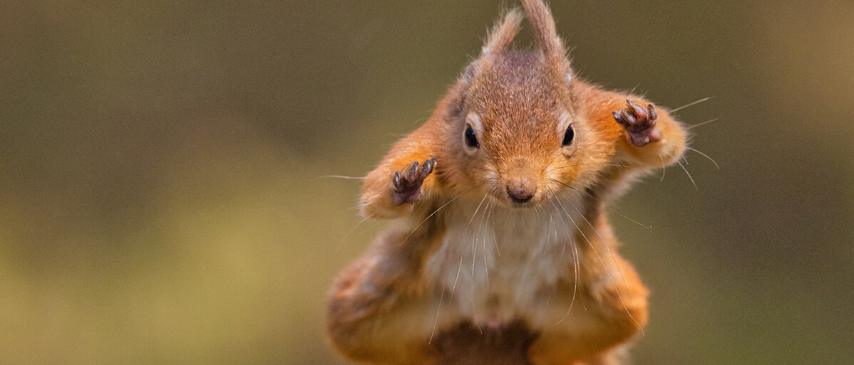 Ein Eichhörnchen im Flug/Sprung frontal© Iain Tall / iStock / Getty Images Plus