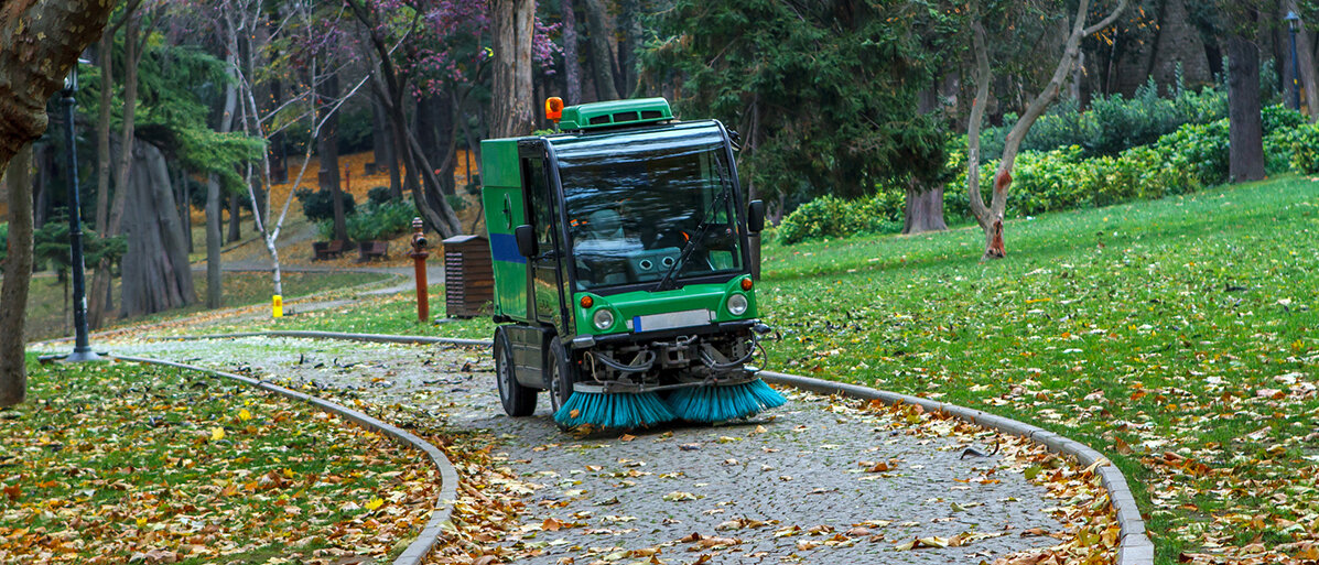 eine kleine Kehrmaschine auf dem Weg eines Parks, die Blätter wegkehrt© Recebin / iStock / Getty Images Plus