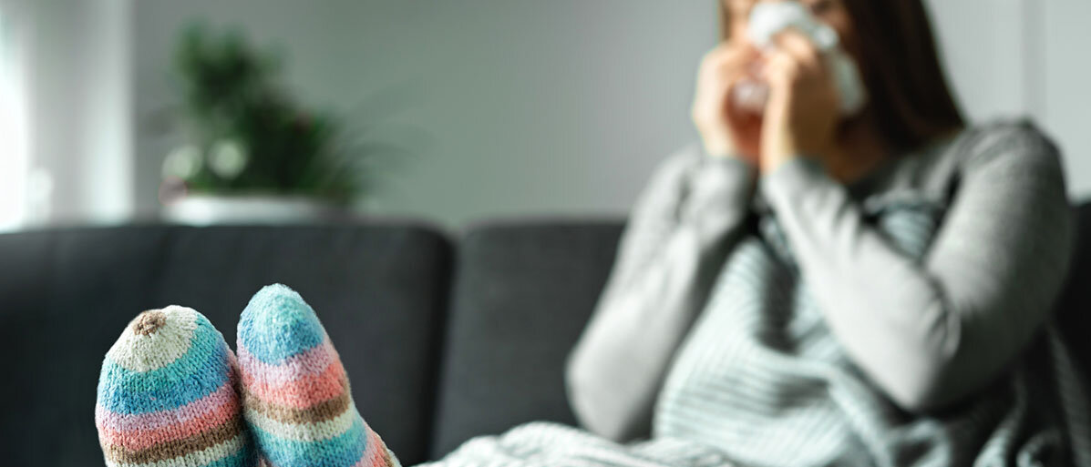 Frau sitzt auf Couch und putzt sich die Nase© Tero Vesalainen / iStock / Getty Images Plus