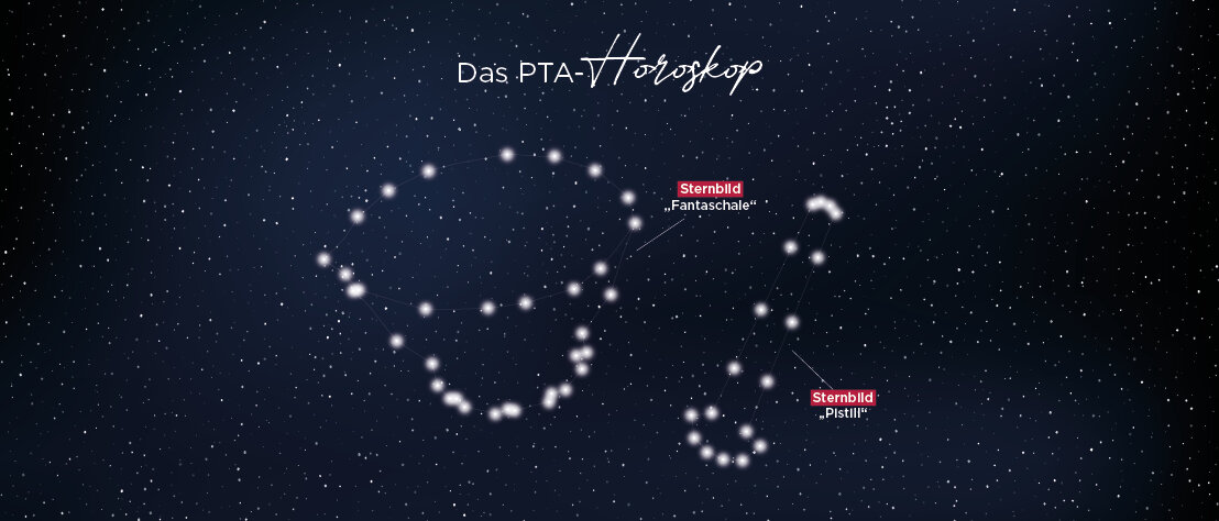 Ein Sternhimmel, auf dem zwei Sternbilder markiert und beschriftet sind: "Fantaschale" und "Pistill". Darüber steht: "Das PTA-Horoskop"© Sergey Balakhnichev / iStock / Getty Images Plus und Christina Brück / UZV