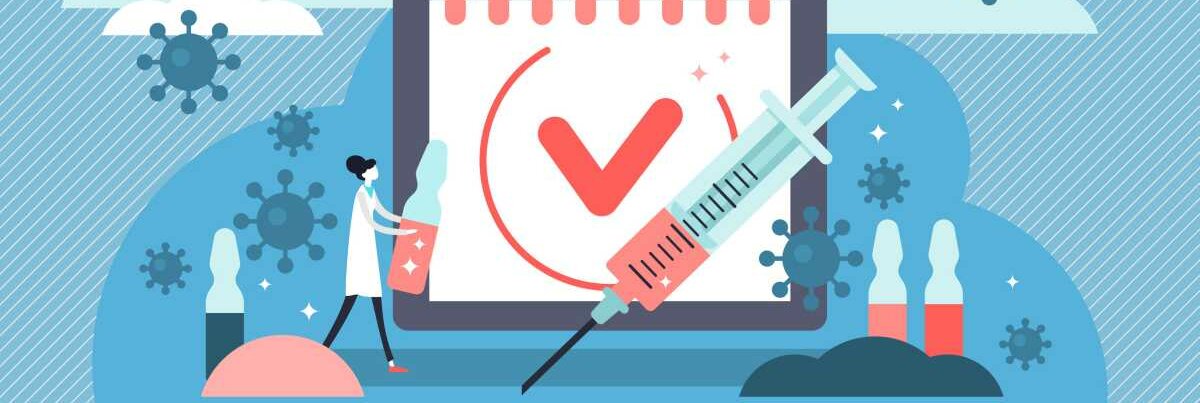 In einer Grafik sind Impfstoffe, Viren, eine Spritze sowie ein großer Haken auf einem Notizblock schematisch dargestellt.