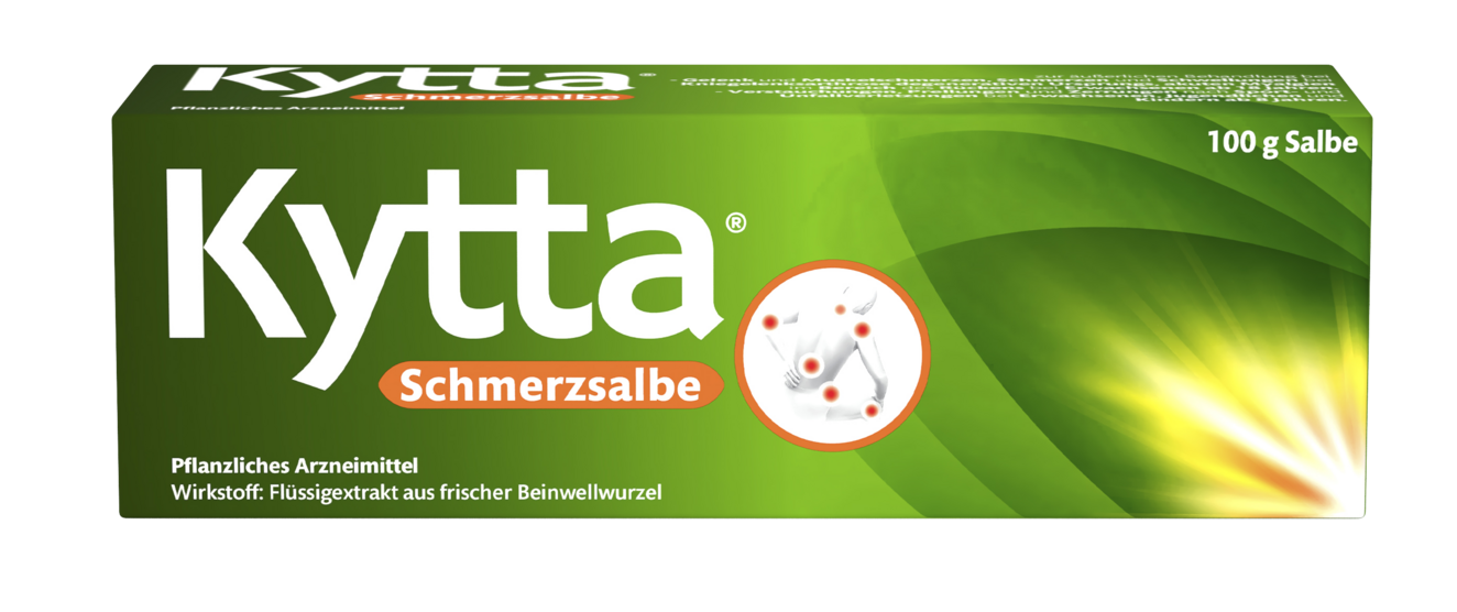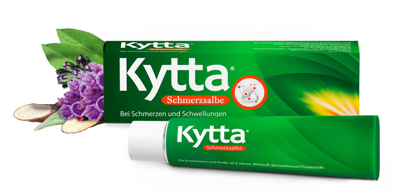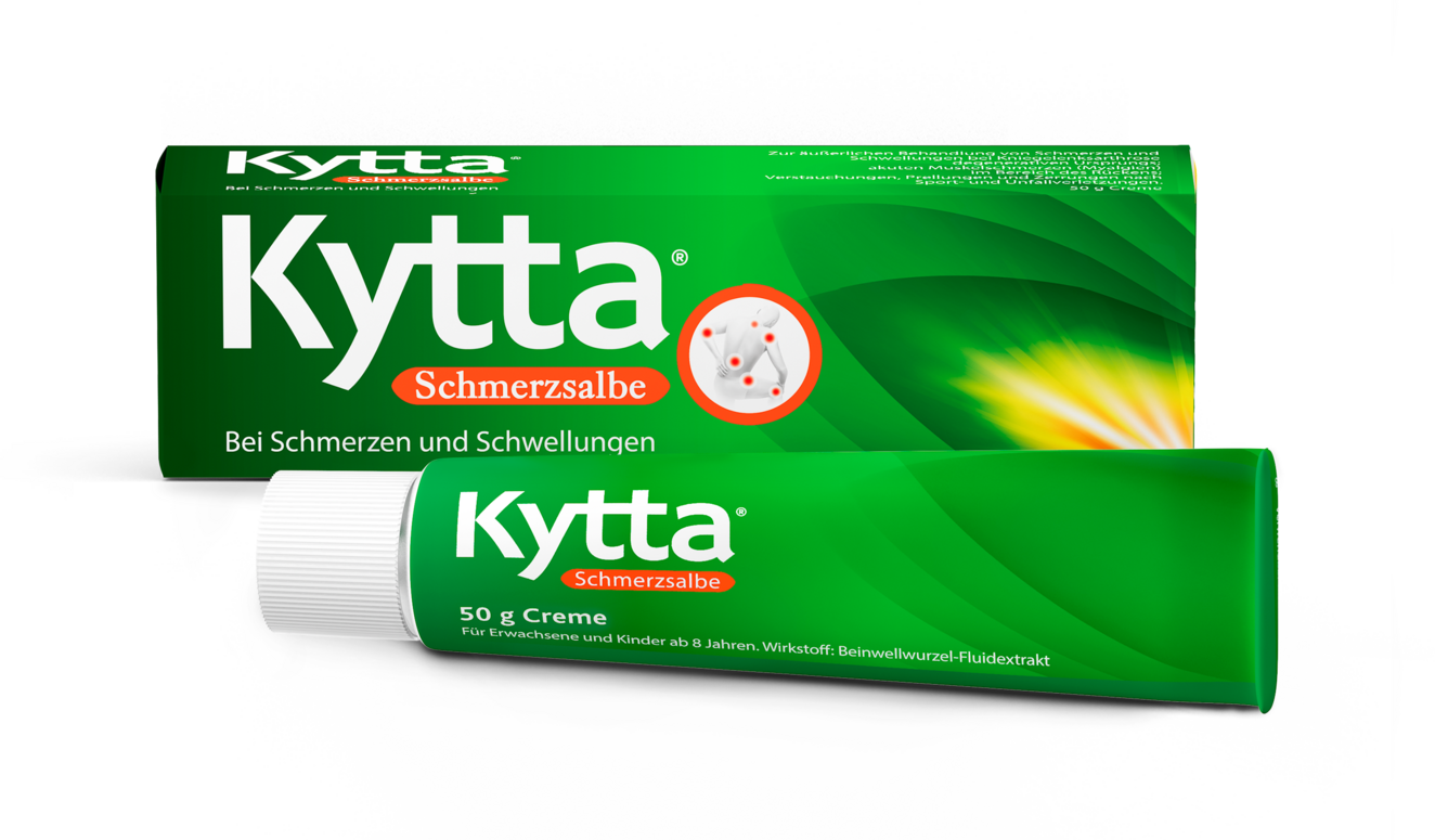 Bezeichnung: Kytta® Schmerzsalbe Wirkstoff: Beinwellwurzel-Fluidextrakt. Zusammensetzung: 100 g Creme enthalten 35,0 g Beinwellwurzel, Fluidextrakt (1:2) mit Ethanol 60 Vol.-%. Sonstige Bestandteile: 2 Phenoxyethanol- [butyl, ethyl, methyl, (2-methylpropyl), propyl] (4-hydroxybenzoat), Natriumhydroxid, PPG-1-PEG-9 Lauryl Glycol Ether, Cetylstearylalkohol, Glycerolmonostearat, Natriumdodecylsulfat, Erdnussöl, gereinigtes Wasser, Lavendelöl (enthält Limonen, Linalool), Fichtennadelöl (enthält Limonen), weitere Duftstoffe als Bestandteile des Parfümöl Spezial PH (enthält u. a. Benzylalkohol, Benzylbenzoat, Citral, Cumarin, Eugenol, Geraniol, Farnesol, Citronellol, Hydroxycitronellal, Limonen und Linalool). Anwendungsgebiete: Erwachsene: Zur äußerlichen Behandlung von Schmerzen und Schwellungen bei Kniegelenksarthrose degenerativen Ursprungs; akuten Myalgien im Bereich des Rückens; Verstauchungen, Prellungen und Zerrungen nach Sport- und Unfallverletzungen. Kinder ab 8 Jahren und Jugendliche: Zur äußerlichen Behandlung von Verstauchungen, Prellungen und Zerrungen nach Sport- und Unfallverletzungen. Gegenanzeigen: Überempfindlichkeit gegenüber einem der Inhaltsstoffe. Nicht auf geschädigter Haut, offenen Wunden, Schleimhäuten, Augen. Kinder unter 8 Jahren. Nebenwirkungen: Häufigkeit nicht bekannt: Erkrankungen der Haut und des Unterhautzellgewebes: lokale Hautreaktionen wie z. B. Kontaktdermatitis, Ekzeme, Schmerzempfindungen und Brennen auf der Haut, Juckreiz, Rötungen sowie Hautausschläge (z.B. in Form von Bläschen); Erkrankungen des Immunsystems: lokale Überempfindlichkeitsreaktionen am Applikationsort, systemische Überempfindlichkeitsreaktionen in Form von Urticaria, sowie Angioödemen, Überempfindlichkeitsreaktionen des Magen-Darm-Traktes (z. B. Übelkeit, Bauchschmerzen), der Augen (z.B. allergische Konjunktivitis), der Atemwege (z. B. allergische Rhinitis, erschwerte Atmung und Spasmen) oder des Herz- Kreislaufsystems (z. B. Blutdruckabfall, Herzrasen). Allergische Reaktionen durch folgende Inhaltsstoffe: Butyl-, Ethyl-, Methyl-, 2-Methylpropyl- und Propyl- 4-hydroxybenzoat (Parabene), Erdnussöl, Parfümöl Spezial PH, Benzylalkohol. Brennendes Gefühl bei geschädigter Haut durch Alkohol (Ethanol). Warnhinweis: Enthält 77 mg Alkohol (Ethanol) pro 1 g Creme. Enthält Erdnussöl, Butyl-, Ethyl-, Methyl-, 2-Methylpropyl- und Propyl- 4-hydroxybenzoat (Parabene), Cetylstearylalkohol, Natriumdodecylsulfat, Duftstoff (Parfümöl) mit Benzylalkohol, Benzylbenzoat, Citral, Cumarin, Eugenol, Geraniol, Farnesol, Citronellol, Hydroxycitronellal, Limonen und Linalool. Pharmazeutischer Unternehmer: P&G Health Germany GmbH, Sulzbacher Straße 40, 65824 Schwalbach am Taunus. Stand: September 2023