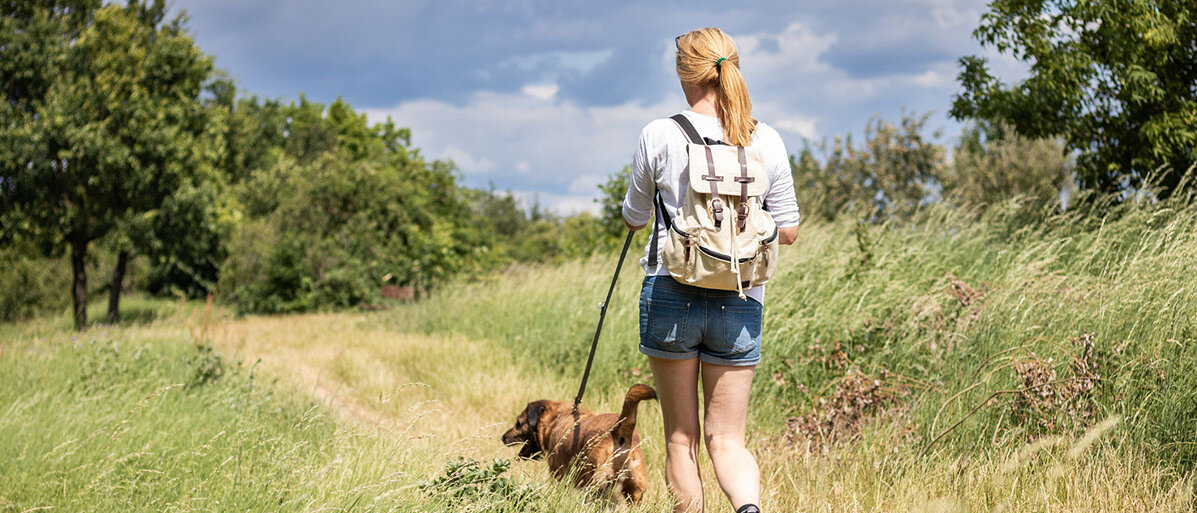 Eine Frau in kurzen Hosen läuft mit ihrem Hund über eine ungemähte Wiese.© Zbynek Pospisil / iStock / Getty Images Plus