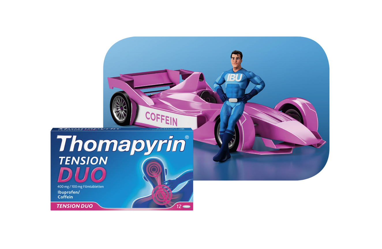 Kennen Sie schon den neuen Thomapyrin® TENSION DUO Superhelden mit seinem Rennwagen aus dem neuen TV-Spot? Falls Ihre Kunden danach fragen, können Sie Thomapyrin® TENSION DUO empfehlen – die neue Ibuprofen-Kombination: jetzt stärker und schneller durch Coffein!