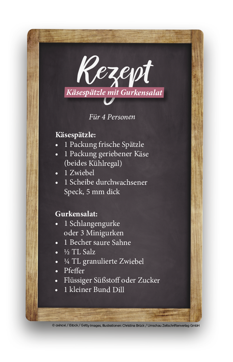 Derweil sie gar simmert und dabei karamellisiert, bereiten Sie fix die Soße zum Gurkensalat: In die saure Sahne kommen Salz, Pfeffer, ein bisschen Zucker oder Süßstoff und Zwiebelgranulat, dazu der Dill. Gurke in Scheiben schneiden, hineingeben, ziehen lassen. Nun geben Sie den klein gewürfelten Speck in die Pfanne und erhöhen die Hitze. Braten ihn aus, vermischen ihn mit der Zwiebel. Öffnen Sie die Packung mit den Spätzle und geben Sie den Inhalt dazu. Vermischen Sie alles, bis es ein bisschen Knusper bekommt und total lecker riecht. Schließlich geben Sie den Käse drüber, direkt aus der Packung. Noch einmal gut vermengen, bis alles miteinander heiß ist und dann ist es fertig. Wirklich.