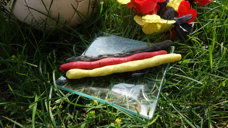 Der Teig wird gedrittelt, da er mit drei verschiedenen Lebensmittelfarben eingefärbt wird. Ich habe schwarz, rot und gelb verwendet. Also: In den ersten Teig kommt nun schwarze Lebensmittelfarbe, in den zweiten rote und in den dritten gelbe. Wichtig ist es, die drei Teige getrennt voneinander, am besten nacheinander, auf einer Backunterlage durchzukneten, bis die jeweilige Lebensmittelfarbe den Teig gleichmäßig eingefärbt hat. Dann zur Kugel rollen und eine Stunde kalt stellen. Bevor die drei Teige weiter verarbeitet werden den Backofen auf 180 Grad Ober- und Unterhitze aufheizen. Ich empfehle hier keine Heißluft, damit die Käsestangen nicht zu trocken werden. Bei Ober- und Unterhitze ist das Backergebnis besser.