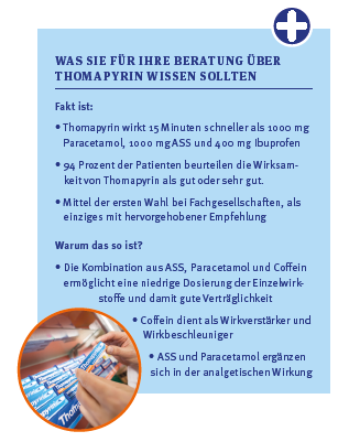 Die Dreierkombination aus ASS, Paracetamol und Coffein lindert Kopfschmerz auf allen relevanten Schmerzsignalwegen – anders als das die nichtsteroidalen Analgetika wie ASS oder Ibuprofen tun. Thomapyrin® hilft mehr Patienten und ist sogar besser verträglich „Eine neue Meta-Analyse belegt, dass die Thomapyrin-Kombination (ASS, Paracetamol, Coffein) bei Migränekopfschmerzen in Summe mehr Patienten hilft als andere OTC-Schmerzmittel und dabei gleichzeitig besser verträglich ist.4