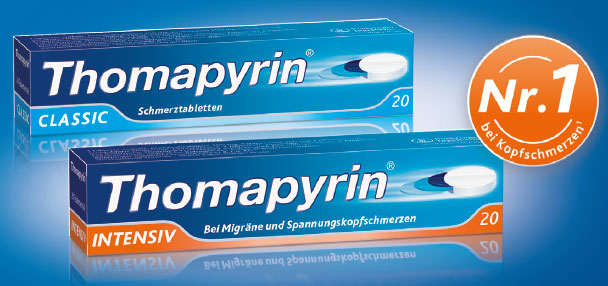 Thomapyrin® CLASSIC Schmerztabletten. Thomapyrin® INTENSIV. Wirkstoff: CLASSIC Schmerztabletten: 1 Tablette enthält 250 mg Acetylsalicylsäure, 200 mg Paracetamol, 50 mg Coffein. Sonst. Bestandt.: Lactose-Monohydrat, Stearinsäure, Maisstärke. Anw.-geb.: Für Erwachsene und Jugendliche ab 12 Jahren bei akuten leichten bis mäßig starken Schmerzen. INTENSIV: 1 Tablette enthält 250 mg Acetylsalicylsäure, 250 mg Paracetamol, 50 mg Coffein. Sonst. Bestandt.: Lactose-Monohydrat, Stearinsäure, Maisstärke. Anw.-geb.: Zur Behandlung von akuten Kopfschmerzen (z. B. Spannungskopfschmerzen) und Migräneanfällen (mit und ohne Aura). Gegenanz.: Überempfindlichkeit gegen Salicylate, NSAIDs oder sonstige Bestandteile; Magen- und Darm-Ulcera; schwere Leber- oder Nierenfunktionsstörungen; schwere, unkontrollierte Herzinsuffizienz; hämorrhagische Diathese; Einnahme von ≥ 15 mg Methotrexat pro Woche; letzten 3 Monate der Schwangerschaft; Kinder bis 12 Jahre. Nebenw.: Häufig: Schwindel, Nervosität, Bauchschmerzen, Mikroblutungen, Sodbrennen, Übelkeit und Erbrechen; Gelegentlich: Durchfall, Palpitationen, Überempfindlichkeitsreaktionen (Haut); Selten: Agitation, Tremor, Tachykardie, Ösophagitis, Hyperhidrose, Erschöpfung, Überempfindlichkeitsreaktionen (z. B. Dyspnoe, Hypotension, anaphylakt. Schock, angioneurotisches Ödem), schwere Hautreaktionen (inkl. Erythema multiforme), gastrointestinale Ulzerationen und Blutungen, Transaminasenerhöhung, Hautrötungen; Sehr selten: Eisenmangelanämie, Hypoglykämie, gastrointestinale Perforation, Leber- oder Nierenfunktionsstörungen, Blutbildveränderungen inkl. Thrombozyto-, Leuko-, Panzytopenie, Agranulozytose, Überempfindlichkeitsreaktionen inkl. Erythem, Urticaria, Bronchospasmus bei NSAID-Allergikern; Häufigkeit nicht bekannt: Blutungen (z. B. Nasen-, Zahnfleisch-, Hautblutung) ggf. verlängerte Blutungszeit (bis 8 Tage nach der Einnahme), Hör-, Sehstörungen, Tinnitus, erosive Gastritis, Verschlechterung infektionsbedingter Entzündungen (mit z. B. nekrotisierender Fasciitis), Schlaflosigkeit. Kopfschmerzen, Somnolenz, geistige Verwirrung können Anzeichen einer Überdosierung sein. Warnhinw.: Schmerzmittel sollen längere Zeit oder in höheren Dosen nicht ohne Befragen des Arztes angewendet werden. Enthält Lactose. Apothekenpflichtig.
