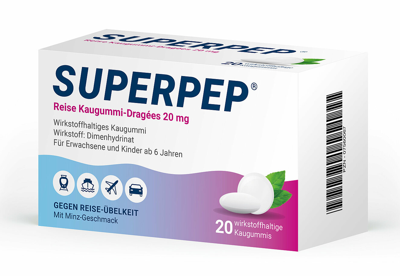 Reiseübelkeit ist ein häufiges Beratungsthema, besonders zu Beginn der Reisesaison. Der bewährte Wirkstoff Dimenhydrinat in Superpep® blockiert die Histaminrezeptoren im Brechzentrum und kann sowohl vorbeugend als auch bei ersten Anzeichen von Reiseübelkeit eingesetzt werden. Durch die einzigartige Darreichungsform als Kaugummi ist er besonders praktisch anwendbar: Superpep® kann unterwegs jederzeit eingenommen und gekaut werden – ganz ohne Wasser. Dank der geringeren Wirkstoffkonzentration verursacht Superpep® in der Regel weniger Müdigkeit und ist individuell dosierbar – durch die Dauer des Kauens oder die Einnahme eines weiteren Kaugummis bis zur Tageshöchstmenge. Ein weiterer Vorteil: Die Kaubewegung selbst kann bei Reiseübelkeit lindernd wirken. Superpep® eignet sich für Erwachsene und Kinder ab sechs Jahren – und ist damit eine Empfehlung für die ganze Familie.