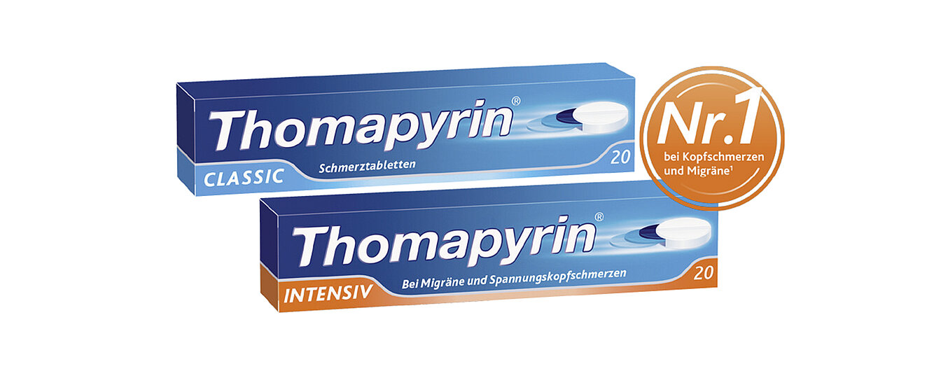 Ein Fall für Thomapyrin®. Die Nummer 1 bei Kopfschmerzen1 kombiniert die drei Wirkstoffe Acetylsalicylsäure (ASS), Paracetamol und Coffein. Die Besonderheit des Trios: ASS und Paracetamol ergänzen sich durch die unterschiedlichen analgetischen Angriffspunkte in ihrer schmerzlindernden Wirkung. Das Coffein verstärkt die Wirkung nicht nur, sondern beschleunigt auch den Wirkeintritt.2 So wirkt Thomapyrin 3-fach, schnell und auf den Punkt gegen Kopfschmerzen. Mit Thomapyrin sind Ihre Kunden also stets gut beraten und bewahren auch in stressigen Situationen einen klaren Kopf.