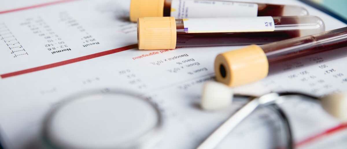 Drei Röhrchen mit Blutproben und ein Stethoskop liegen auf einem Klemmbrett mit Werten eines Patienten.