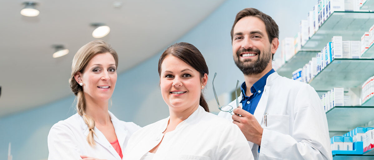 Zwei Frauen und ein Mann stehen nebeneinander und tragen einen weißen Kittel in der Apotheke© kzenon / iStock / Getty Images Plus