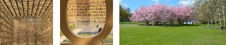 Globale ThemengärtenVon der Tropenhalle mit dem balinesischen Garten zu weiteren asiatischen Anlagen (koreanisch, japanisch, chinesisch). Von dort zum christlichen Garten, der angelegt ist wie der Kreuzgang einer Klosteranlage und ausgeschmückt mit luftigen Wänden aus goldfarbenen Metallbuchstaben. Sie bilden Texte zum Thema „Der Mensch in der Natur“. Gerade entsteht in der Nachbarschaft ein jüdischer Garten. Vorbei am Staudengarten und dem Irrgarten mit einem grünen Labyrinth hin zum Renaissace-Garten. Hinter dessen geometrischen Hecken und Beeten sowie der sattgelben Loggia erhebt sich gut erkennbar ein Teil der besagten Hochhäuser. Das wirkt einerseits ernüchternd, andererseits aber auch reizvoll in seinem Kontrast – dit is Berlin. Und dann sind da noch der englische Landschaftsgarten rund um ein kleines Cottage und der orientalische Garten mit bunten Fliesen und Wasserspielen.