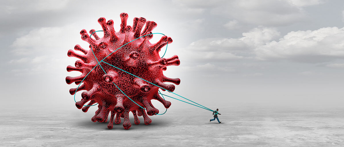 Illustration: Mann ist an riesiges Virus gebunden und zieht es hinter sich her.© wildpixel / iStock / Getty Images Plus