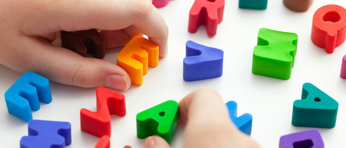 verschiedene bunte Buchstaben und Kinderhände, die einzelne Buchstaben greifen© Professor25 / iStock / Getty Images Plus