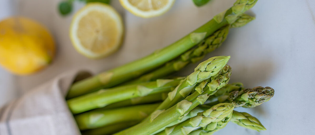 Bund Spargel in Küchentuch gewickelt, daneben aufgeschnittene Zitronen© A_Lein / iStock / Getty Images Plus