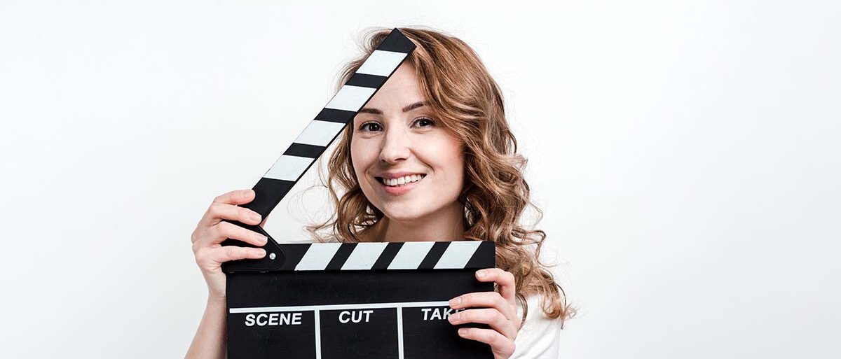 Eine Frau in weißem T-Shirt hält eine Filmklappe, als würde sie sie gleich Zuschlagen, damit die Szene beginnt.© ISvyatkovsky / iStock / Getty Images