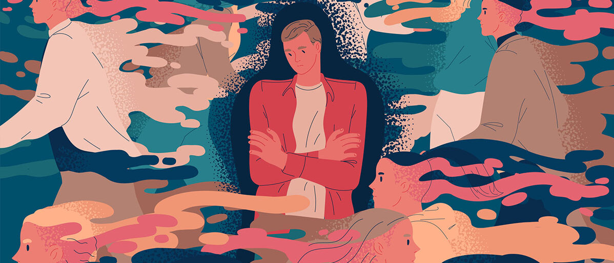 Bildcollage Mann ist einsam in der Mitte um ihn herum sind Menschen© undrey / iStock / Getty Images Plus