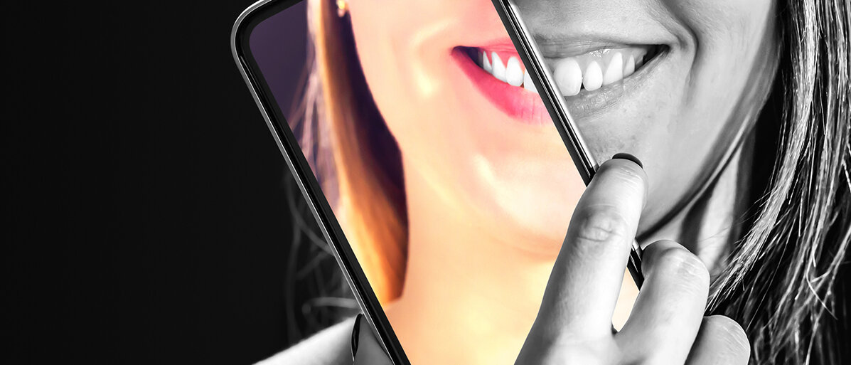 Eine lachende Frau in Schwarzweiß mit Handy vor dem Gesicht, auf diesem ist der Hautausschnitt farbig dargestellt© Tero Vesalainen / iStock / Getty Images Plus