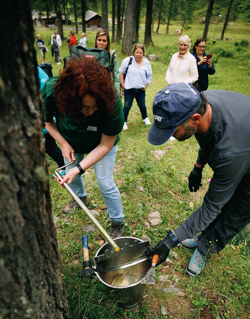 In dieser Zeit hat sich das Harz im Bohrkanal gesammelt und kann von dort mit speziellen Werkzeugen entnommen werden. Die Regeln und die Technik der Har­zer werden von Generation zu Gene­ration weitergegeben. Schon im 18. Jahrhundert wurde die Gewinnung von Lärchenharz gewerblich durch­geführt.