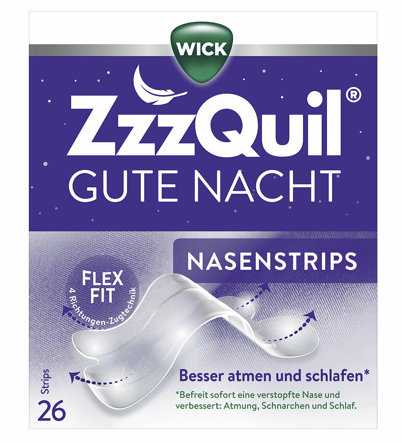 fördern erholsamen Schlaf, indem sie den nasalen Luftstrom verbessern und Schnarchen reduzieren. Die Nasenstrips befreien sofort eine verstopfte Nase und verbessern: Atmung, Schnarchen und Schlaf. WICK ZzzQuil® Gute Nacht Nasenstrips sind fürempfindliche Haut geeignet, dermatologisch getestet und hypoallergen. Die Strips lassen sich einfach entfernen, sindgeruchsneutral und frei von Duftstoffen. Sie öffnen die Nase sofort** und erleichtern das Atmen* während der ganzen Nacht. Die Nasenstrips können ergänzend zu anderen Schlafmitteln oder Arzneimitteln, wie beispielsweise abschwellenden Nasensprays oder Allergie- und Erkältungsprodukten, angewendet werden.