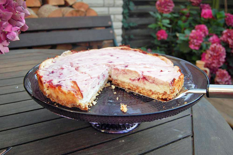 Die Frischkäsemasse gleichmäßig auf den Boden streichen. Die frischen Himbeeren waschen und trocknen, bei Tiefkühlbeeren entfällt dieser Arbeitsschritt. Beeren mit 30 Gamm Zucker in einem hohen Gefäß mit einem Passierstab pürieren. Dann mit einem Löffel wellenartig unter den Teig mischen. Im vorgeheizten Backofen in 40 bis 45 Minuten backen. Fertig gebackenen Cheesecake kurz in der Form auskühlen lassen, erst dann herauslösen. Am besten lässt er sich anschneiden, wenn er vollständig abgekühlt ist.