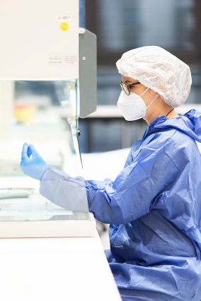 Natürlich haben wir sehr schnell gemerkt, dass wir sechs Dosen aus einem Vial bekommen und sind wirklich froh diese auch nutzen zu können. Die Apotheke im RMCC Wiesbaden ist generalstabsmäßig geplant. Der Bereich der aseptischen Herstellung ist von den normalen Zonen abgetrennt und darf nur mit zweifachen Überschuhen betreten werden. Die Herstellung findet in der Aura Mini™ Box, eine Laminar-flow-Kabine, statt. Wir tragen alle Handschuhe und die Person, die herstellt, hat noch ein zweites Paar darüber. Überall stehen Desinfektionsständer und es gibt genaue Desinfektionsprotokolle. Wir arbeiten im Vier- Augen-Prinzip. Eine PTA reicht an, die andere PTA stellt her und ist mit den doppelt behandschuhten und desinfizierten Händen nur noch in der Aura Mini™ Box.