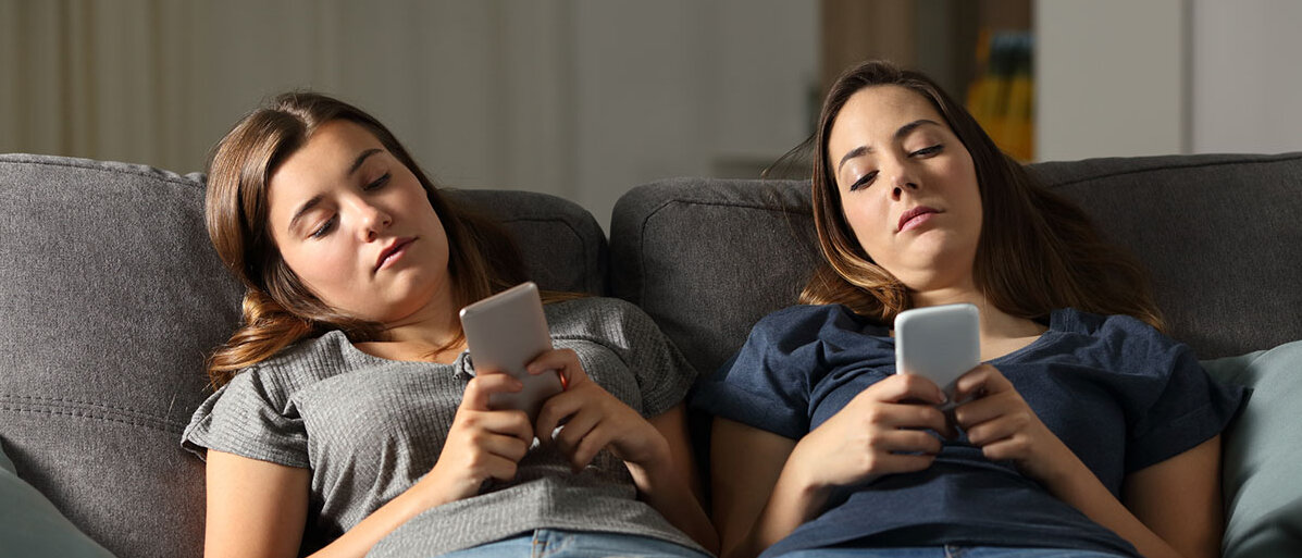 Zwei Teenager Mädchen haben sich nebeneinander auf eine Couch gefläzt und schauen auf ihre Smartphones.© AntonioGuillem / iStock / Getty Images Plus