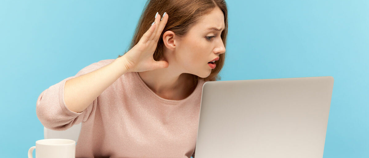Frau sitzt vor Laptop und hält sich Hand ans Ohr weil sie schlecht hört© Khosrork / iStock / Getty Images Plus