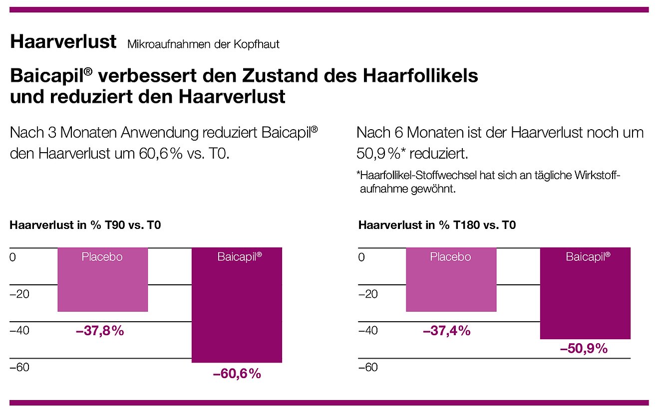 Der Wirkstoffkomplex Baicapil® kombiniert die pflanzlichen Wirksubstanzen Baikal- Helmkrautwurzelextrakt, Soja- und Weizenkeimextrakt. Die Wurzel des Baikal- Helmkrauts (Scutellaria baicalensis) wird häufig in der Chinesischen Medizin verwendet. Die enthaltenen Flavonoide, u. a. Baicalin, besitzen antioxidative und antiinflammatorische Eigenschaften.6 So kann Baicalin dermale Papillenzellen, mRNA-Expression von Wachtsumsfaktor 1 und (IGF1) und den vaskulär endothelialen Wachstumsfaktor aktivieren.7 Dieser Vorgang kann die Telogen-Phase in die Anagen-Phase umwandeln. Eine In-vivo-Studie mit 3%-iger Baicapil®-Haarlösung zeigte eine signifikante Zunahme der Dichte und der Dicke der Haare sowie eine Steigerung des Haarwachstums nach dreimonatiger Anwendung. Das Anagen-Telogen-Verhältnis zeigte eine Steigerung des Anagen-Verhältnisses um 12,7 % und eine Abnahme des Telogen-Verhältnisses um 27,2 % nach 180 Tagen Anwendung. Der Haarverlust ließ sich nach sechs Monaten Anwendung um 50,9 % reduzieren. Auch auf die Größe der Haarwurzel und die Messung der Haardichte wirkte sich die Baicapil®-Behandlung nach 180 Tagen nachweislich positiv aus.8