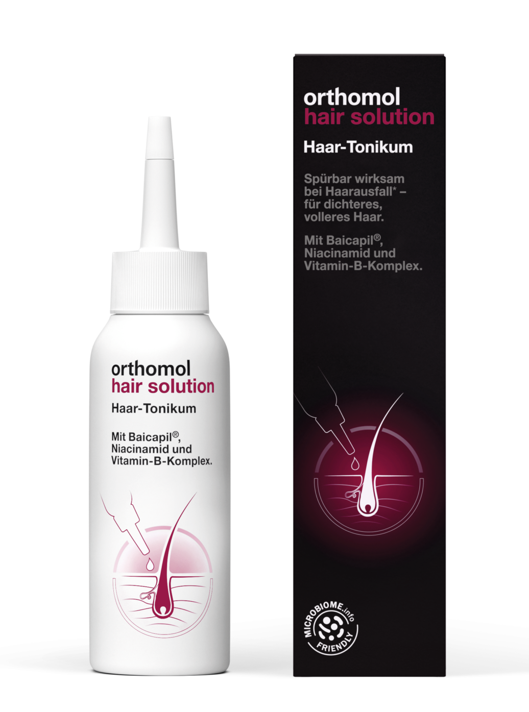 Orthomol Hair Solution ist ein Kosmetikum bei Haarausfall* und für dichteres, volleres Haar, mit dem Wirkstoffkomplex Baicapil® sowie Aminosäuren, Vitaminen und Mineralstoffen. Im Rahmen der Microbiome-friendly-Testung wurde die Mikrobiom-Freundlichkeit des Haartonikums bestätigt. Für dieses Siegel werden die Auswirkungen kosmetischer Produkte auf die Diversität und die Vitalität typischer Mikroorganismen sowie das Gleichgewicht der am häufigsten vorkommenden Hautkeime untersucht. Auch wird die mikrobiologische Reinheit des Produktes selbst sichergestellt.