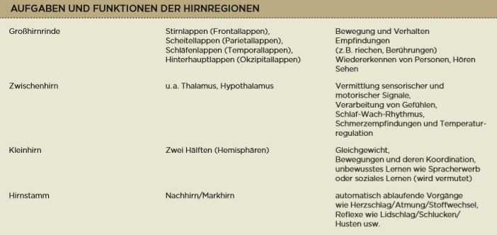 Ein Blick ins Gehirn Unser Gehirn leistet unfassbar viel, 24 Stunden am Tag, sieben Tage die Woche. Dabei wiegt es gerade einmal im Schnitt 1400 Gramm, abhängig von Geschlecht und Körpergröße. Die Größe oder das Gewicht des Gehirns hängen allerdings nicht mit der Intelligenz eines Menschen zusammen. Trotzdem ist es bemerkenswert, wie dieses verhältnismäßig kleine Organ (zum Vergleich: eine Leber wiegt ähnlich viel) komplexe Bewegungsabläufe, Gedankengänge und Emotionen verarbeitet und steuert. Dazu müssen Milliarden von Nervenzellen ständig mit Hilfe elektrischer Impulse miteinander in Kontakt stehen. Aber erst einmal zum Aufbau. Zusammen mit dem Rückenmark bildet das Gehirn das ZNS. Es besteht aus zwei Hälften, die über den sogenannten Balken miteinander verbunden sind. Es lässt sich in verschiedene Hirnregionen einteilen, die unterschiedliche Funktionen im Körper wahrnehmen: