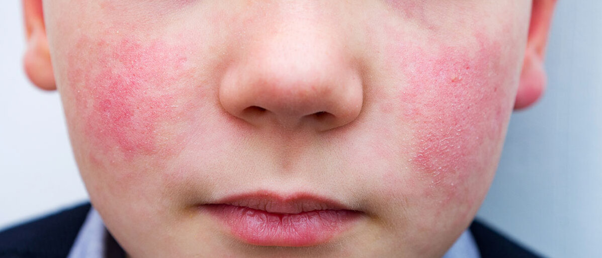 Typisch ist der Hautausschlag, der ein bis zwei Wochen nach Ansteckung auftritt. Erst bilden sich schmetterlingsförmige, großfleckige Rötungen auf den Wangen, wie Hundsdörfer beschreibt. Ein bis zwei Tage später sind solche Rötungen auch auf Schultern, Oberarmen, Oberschenkeln und Gesäß zu beobachten, ziehen sich mitunter wie Girlanden um die Gliedmaßen.